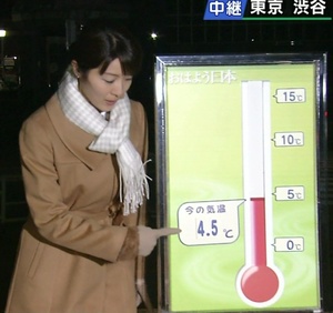 | Même sur le pot, les paparazzis importunent Kou Shibasaki... | - CHGUVNH? | Note aux cons : quand les potiches japonaises ont un gros manteau, une écharpe et montrent un panneau avec un thermomètre, c'est qu'il fait froid au Japon... |