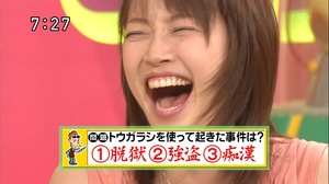 | Sae Nakarai en présentatrice météo, et c'est tous les jours l'été... | Après avoir vendu des iPhone à des gens qui n'avaient aucun ami à appeler, Apple, bien aidé par Waka Inoue en guise de mascotte, lance le premier téléphone invisible: le iTransparent! Et n'oubliez pas, si vous ne courrez pas l'acheter dans les trois premiers jours, Steve Jobs peut vous retirer son amour! | En période de crise, faites comme Aya Ueto, stockez de l'essence où vous le pouvez! |