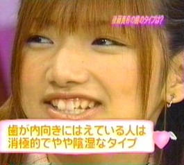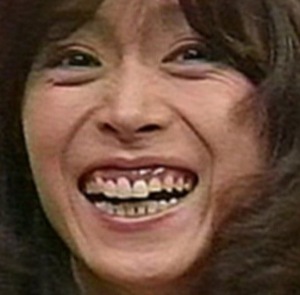 On n'a rien contre les gens qui souffrent de problèmes de dentition, mais on a du mal à comprendre comment il est possible que de tels défauts puissent confirmer la popularité de certaines idoles! Les problèmes de "yaeba" (canines proéminentes), "deppa" (dents qui sortent), "ranguiba" (mâchoire irrégulière) sont légions au Japon, mais peu de gens font corriger ces défauts qui seraient chez nous un lourd handicap. Au résultat, on a des mâchoires d'idoles très exotiques qui choquent peu le public nippon puisque le phénomène est courant chez eux. |